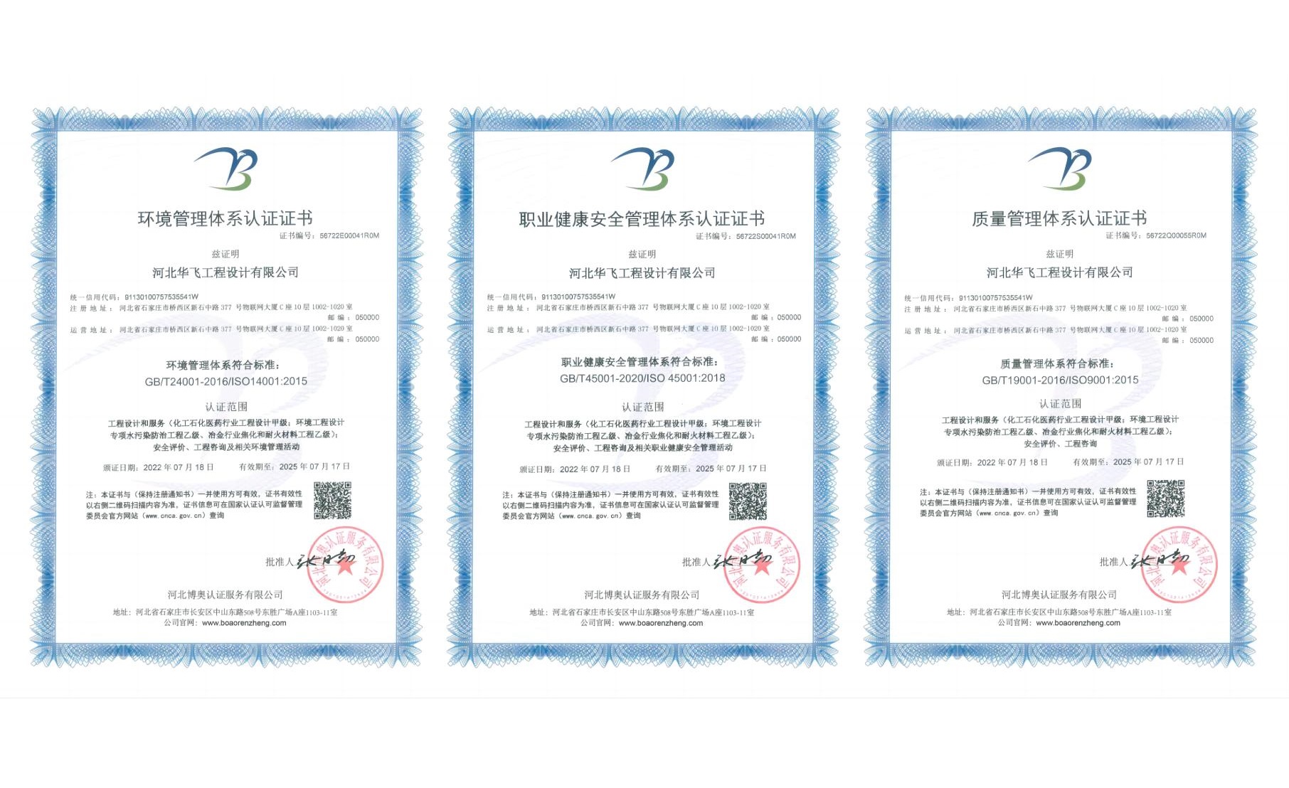 Hebei Huafei Engineering Design Co., Ltd. continually strives for excellence in the field of engineering design, earning the trust and praise of its clients through high-quality services and an outstanding management system. The company has been awarded the following three major certifications:
