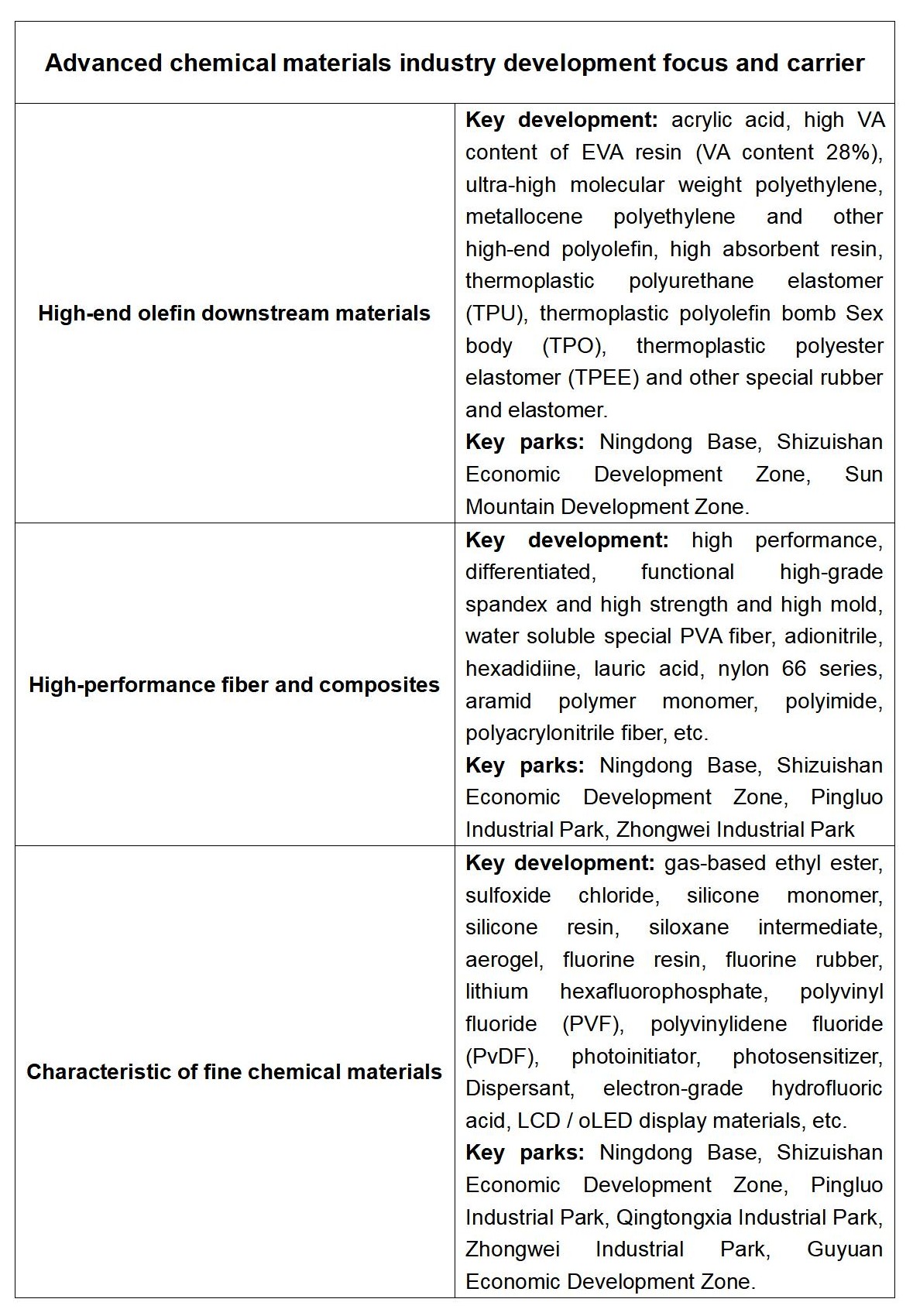 The chemical new materials industrial cluster, relying on the Ningdong National Modern Coal Chemical Industry Demonstration Zone, Shizuishan Economic Development Zone, Pingluo Industrial Park and Zhongwei Industrial Park, extends and develops high-end resins, high-performance fibers and composite materials, polyurethane materials, engineering plastics, special rubbers and other products, driving the modern coal chemical industry chain to extend downstream. Integrate and develop with industries such as automobiles, textiles, aviation, and electronic information.